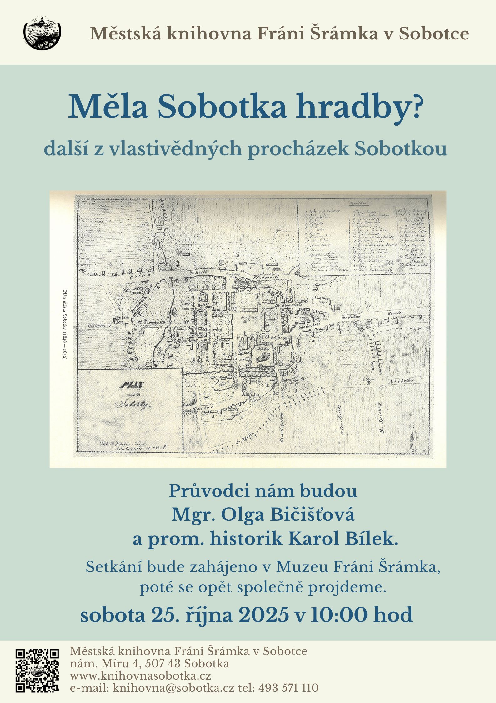 Setkání proběhne v sobotu 25. října v 10:00hod, bude zahájeno přednáškou v Muzeu Fráni Šrámka, poté, pokud nám počasí dovolí, se projdeme po stopách soboteckých hradeb?