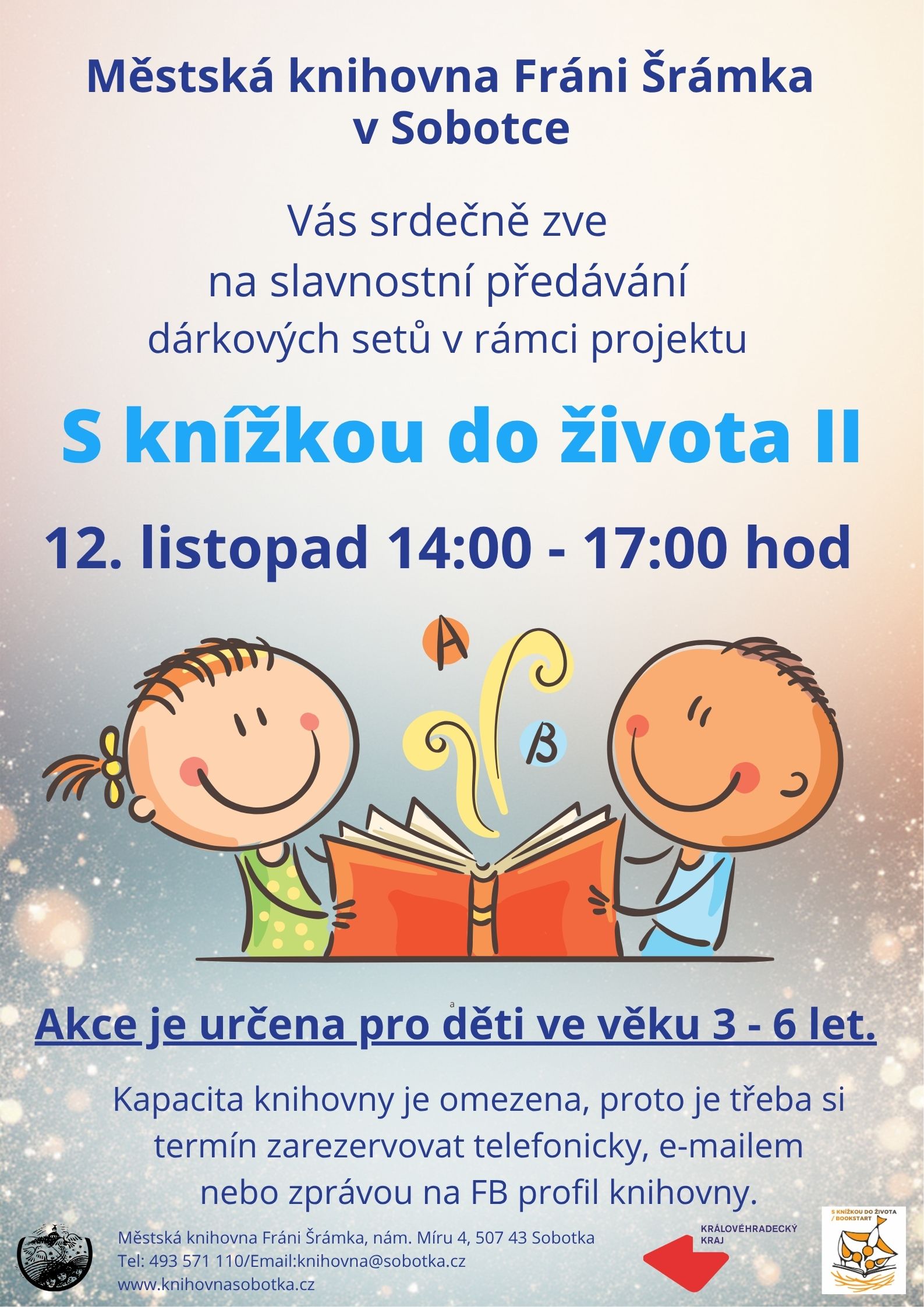 Srdečně vás zveme na slavnostní předávání dárkových setů v rámci projektu S knížkou do života II, které proběhne 12. listopadu od 14:00 do 17:00 hod. Akce je určena pro děti ve věku od tří do šesti let. Kapacita knihovna je omezena, proto je třeba si termín zarezervovat telefonicky, e-mailem nebo zprávou na FB profil knihovny. Děkuji za pochopení a těším se na vás.