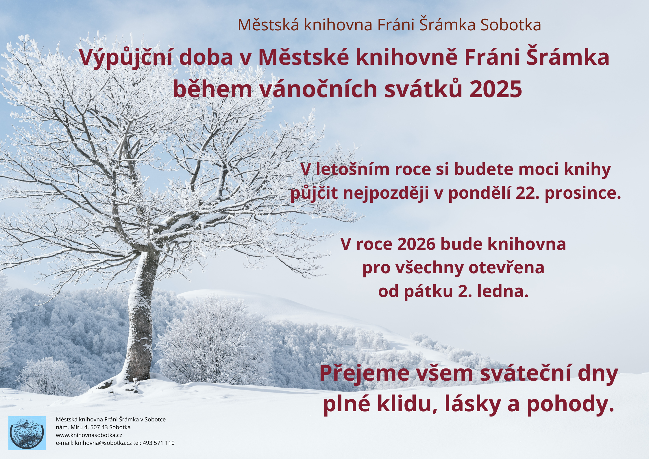 Pro své čtenáře bude knihovna otevřena do pondělka 22. prosince 2025 v běžné otevírací době. V novém roce se na Vás budu těšit od pátku 2. ledna 2026.